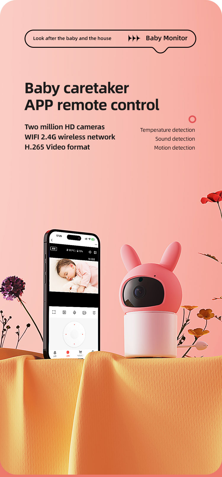 Remote camera functions (connects to the internet and mobile app, remote control, photo/video capture, monitoring, music playback)